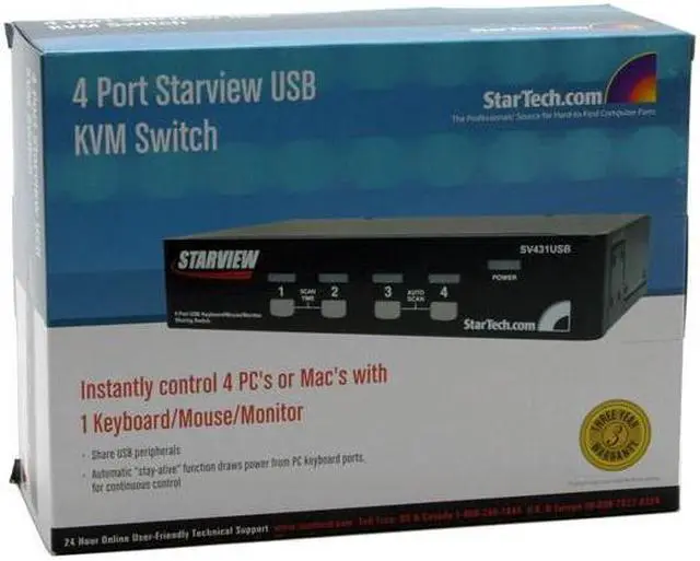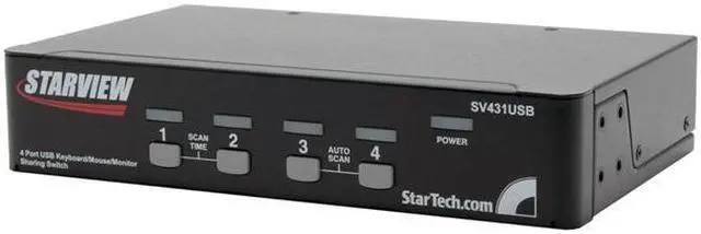 The SV431USB 4 Port rack mountable VGA USB KVM Switch with Hub offers simple control of up to four computers from a single monitor/display and USB peripheral set (keyboard, mouse).