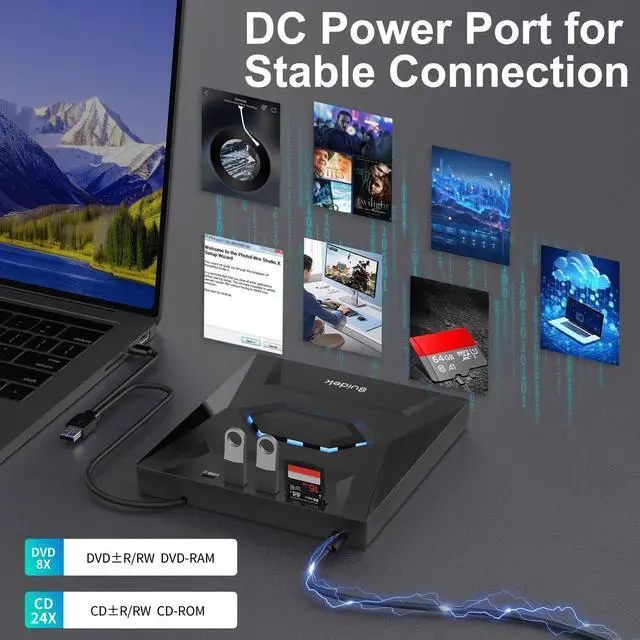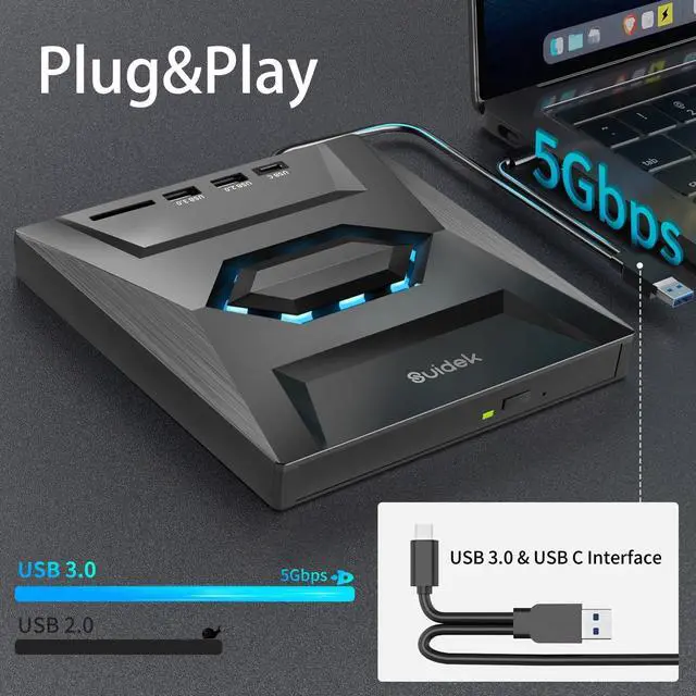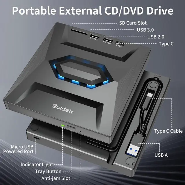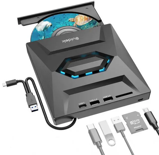 • External CD DVD DriveThis external dvd drive not only reads CDs and DVDs, but can also be used as a USB hub. Including 1*USB 2.0 Port, 1* USB 3.0 Port, 1*Type C Port, 1*SD Card Slot.The USB Hub makes it easy to connect the mouse, keyboard and other USB devices. You can also use the card reader function to transfer your photos, videos or data to PC.