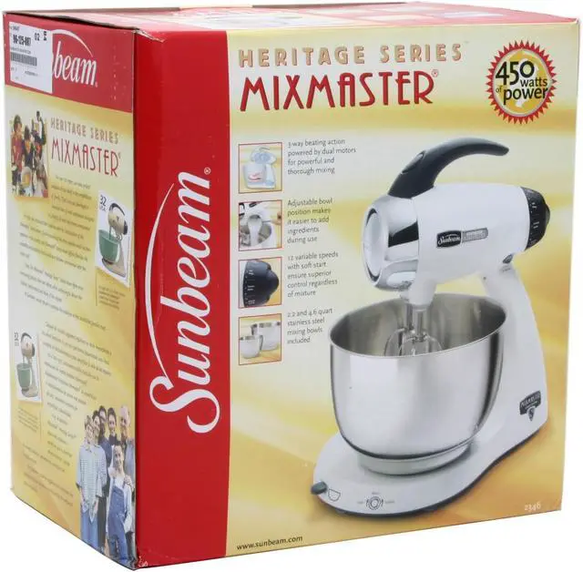 | Features | Powerful 450-watt motor for exceptional performance 12-speed control for versatility Full die-cast metal construction for stability Dual motor for 3-way beating action Heavy-duty beaters, wire whisks and dough hooks for creative mixing Synchronized bowl and beater speeds One brushed stainless steel mixing bowl |