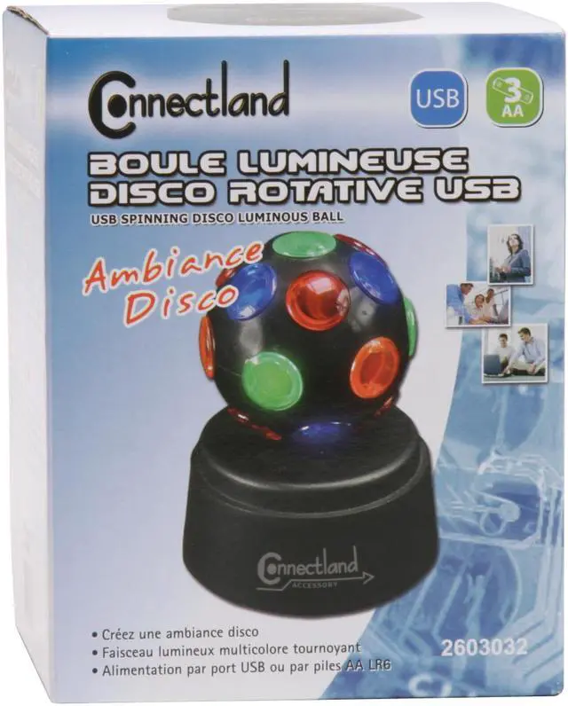| Specifications | Luminous and spinning decoration Disco atmosphere with lighting effects Powered by USB port or by 3 x AA LR6 1.5 V batteries Switch ON/OFF |