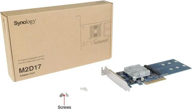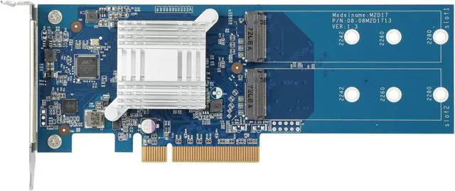 | Features | Applied Models DS1517+ DS1817+ PCIe Interface: PCIe 2.0 x8 Supported Form Factor: 2280 / 2260 / 2242 Bracket Height: Low Profile Operating Temperature: 5 ~ 40 degree Celsius (40 ~ 104 degree Fahrenheit) Storage Temperature: -20 ~ 60 degree Celsius (-5 ~ 140 degree Fahrenheit) Relative Humidity: 5% to 95% RH |