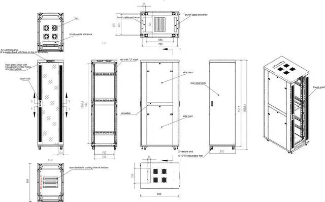 Features: 4 fan cooling panel, capacity 440m3/h Air Temperature Control System (THERMOSTAT) 8-way PDU Fixed vented shelf Heavy duty feet and casters with "brake" option Lockable latch handles Mounting hardware (Set of bolts/nuts - 50 pcs) Front door – glass with hexagon perforated metal frame (optionally, steel mesh front door) Lockable and removable doors, side and rear panels Dust-tight brush strip panels for cable entry U-marking mounting rails