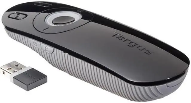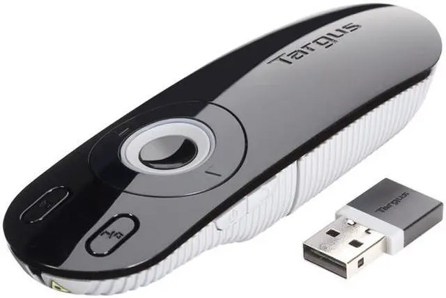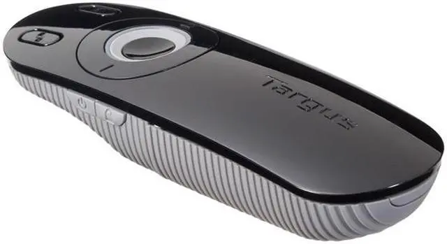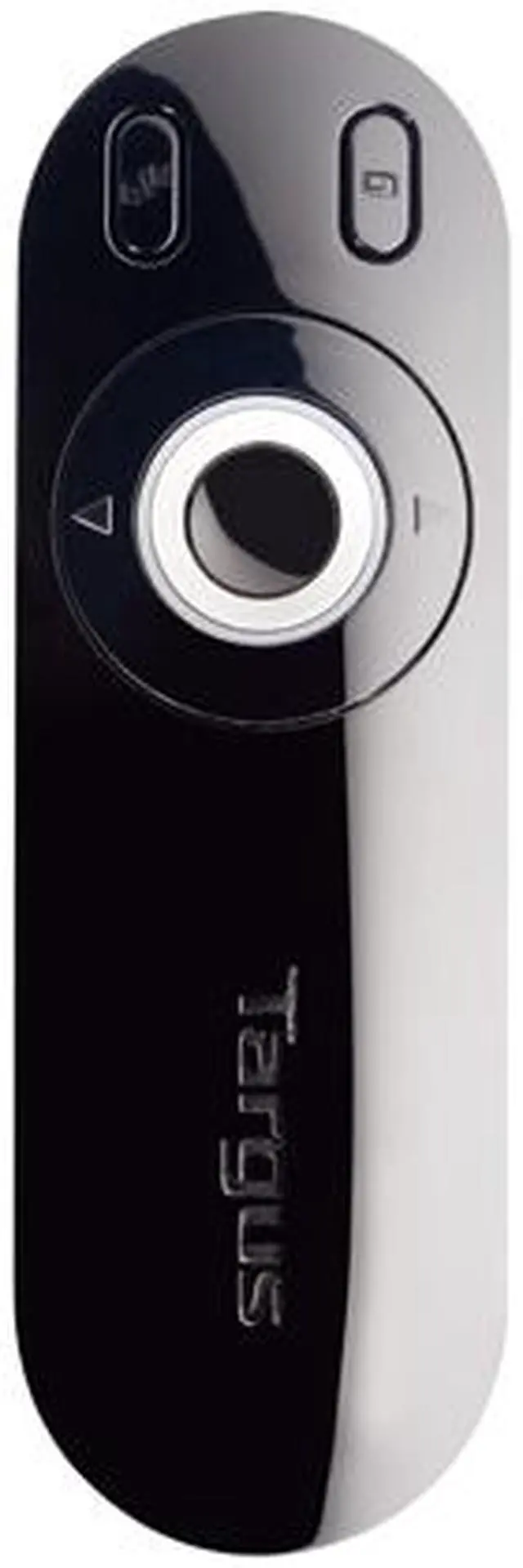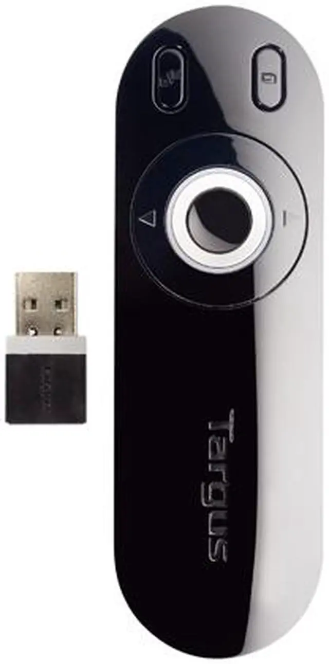 The Targus Laser Presentation Remote features a simplistic button layout, making it easy to give presentations. The patent-pending KeyLockTM Technology locks non-essential buttons when not needed to help eliminate accidental button presses. The integrated laser pointer allows the presenter to highlight important content while the backlit buttons provide visibility in environments with low lighting. The latest RF 2.4GHz cordless technology works from up to 50ft away, providing flexibility while presenting in large conference rooms or classrooms.