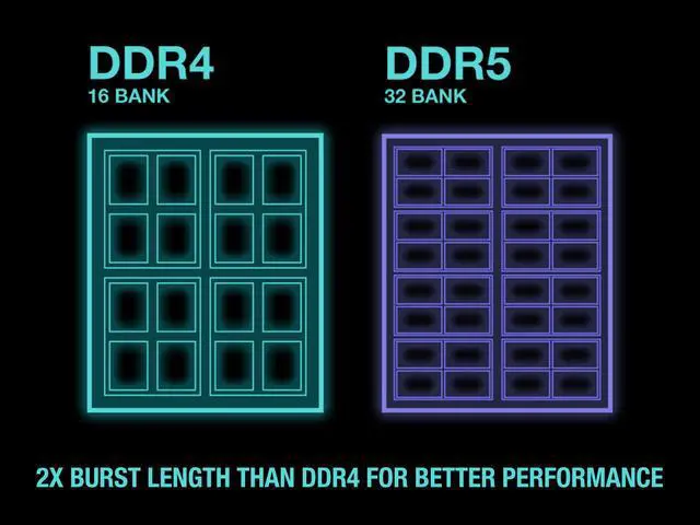 DDR5 allows up to 32 banks ,comprised from 8 bank groups, doubling the access availability from the 16 banks available in DDR4 standards, the DDR5 burst length is also twice as much as DDR4 burst lengths.