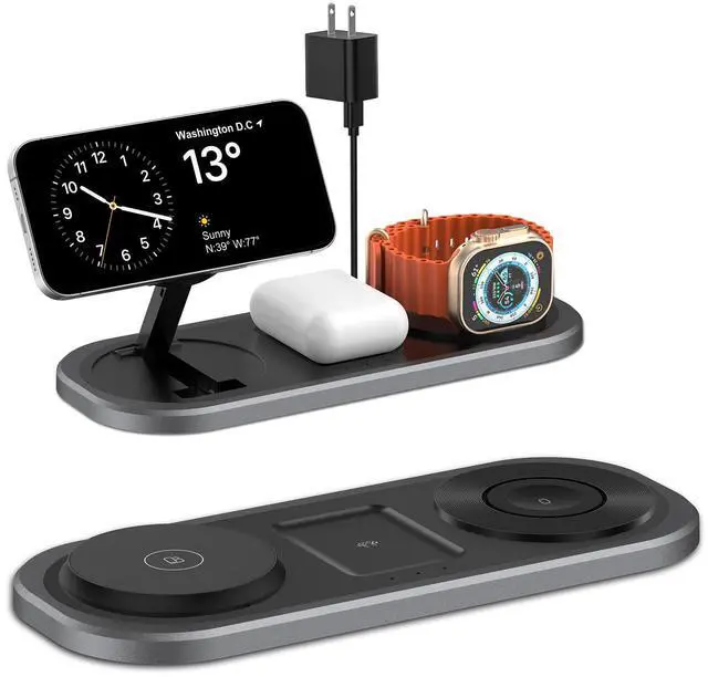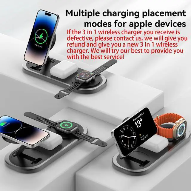 3 in 1 Wireless Charger for iPhone 17 Pro Max, iPhone 17 Pro, iPhone Air, iPhone 17, iPhone 16 Pro Max, iPhone 16 Pro, iPhone 16 Plus, iPhone 16, iPhone 15 Pro Max, iPhone 15 Pro, iPhone 15 Plus, iPhone 15, iPhone 14 Pro Max, iPhone 14 Pro, iPhone 14 Plus, iPhone 14 iPhone 13 Pro Max, iPhone 13 Pro, iPhone 13, iphone 13 mini, iPhone SE (3rd generation), iPhone 12 Pro Max, iPhone 12 Pro, iPhone 12, iphone 12 mini; For Apple Watch 11/10/9/8/7/6/5/4/3/2/1/SE 3/SE 2/SE/Ultra3/Ultra 2/Ultra; For Airpods Pro 3 with wireless charging function/Airpods Pro 2 with wireless charging function/Airpods Pro with wireless charging function/Airpods 3 with wireless charging function/Airpods 2 with wireless charging function/AirPods 4 with wireless charging function