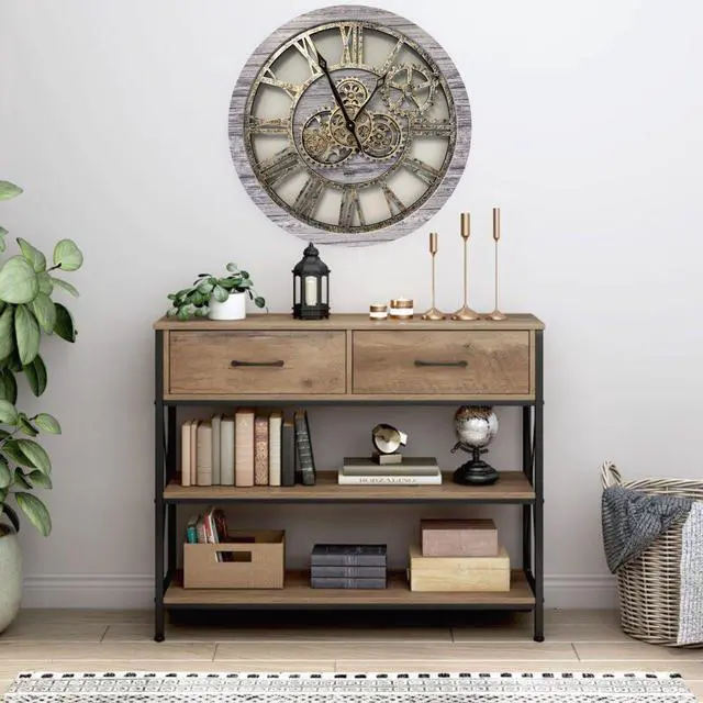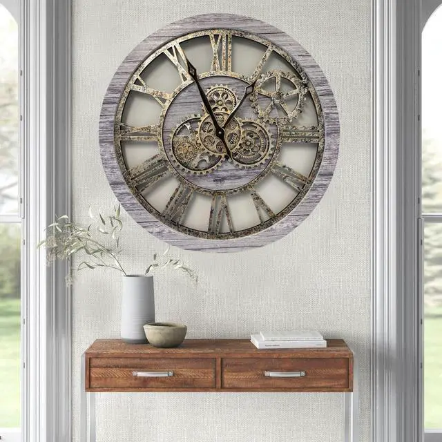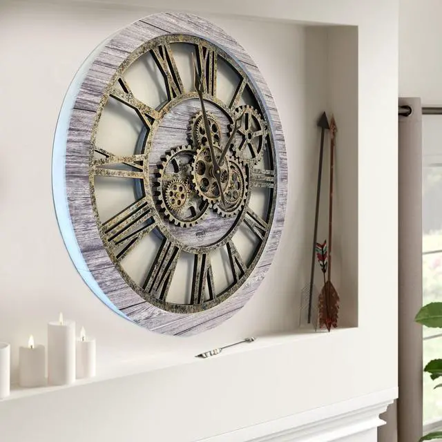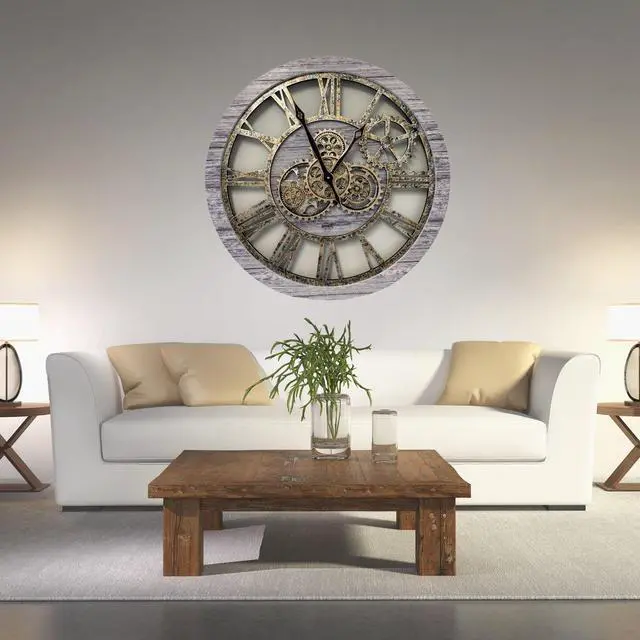 The Gears Clock 24'' Real Moving Gear Clock is a piece of art on your wall. MOVING GEAR | the Movement of the Gear makes the clock a living element in the environment in which it is placed. Great Decor in any room. QUALITY | Made using high-grade materials to ensure the clocks durability, the wood edge is left unmolded to leave a vintage aspect. PERFECT FOR ALL ROOMS | Improving life industrial vintage real gear clock is the perfect clock to dress up a wall in your kitchen, living room, bedroom, bathroom, family room, den, office, anywhere! Requires three AA battery, and is easily hung on any wall.