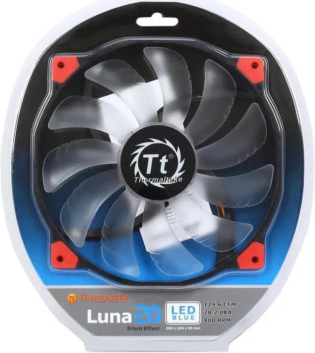 The Thermaltake Luna 20 LED Series Case Fans go big when it comes to cooling. Designed with a unique custom anti-vibration mounting system, experience reduced noise and improved stability. Balanced with an 11-blade fan design, provide optional air flow for large PC systems to optimize ambient temperatures for today’s most demanding PCs. Available in Red, White and Blue LED models, customize your PC for performance, in style.