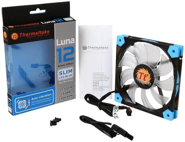 With double-curved nine fan blades for optimal airflow, hydraulic bearing for silent operation, anti-vibration mounting mechanism and attention-getting LED illumination, the Thermaltake 120mm Luna 12 Slim delivers virtually everything you’d expect from a quality Thermaltake case. But most of all, it measures incredible 15mm in thickness, making Luna 12 Slim a great choice for mini chassis or modding situations where space is at a premium. Luna 12 Slim LED series is available in three colors (red/white/blue) to match you case and components.