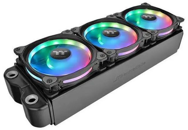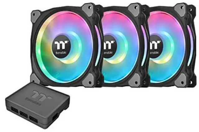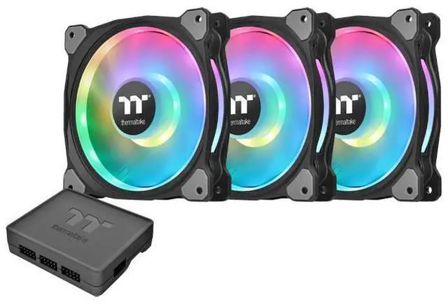 Riing Duo 12 RGB Radiator Fan TT Premium Edition (3-Fan Pack) Double the Rings TT RGB PLUS Patented TT RGB PLUS Software & App SyncALL, Say “Hello TT” Thermaltake AI Voice Control Works with Razer Chroma Works with Amazon Alexa Easy to Control PWM with Nine Fan Blade Design Anti-Vibration Mounting