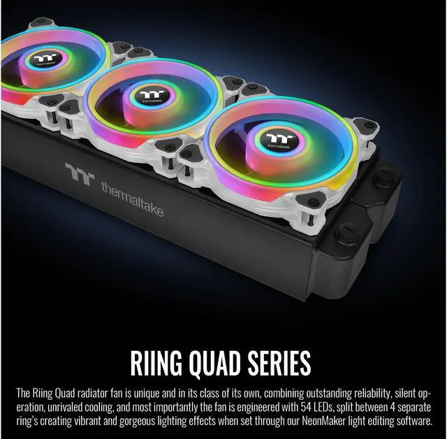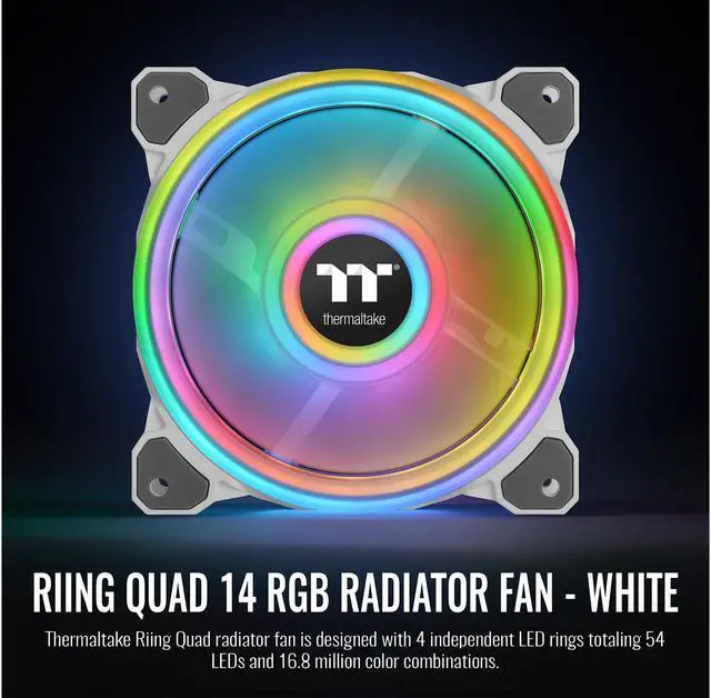 Thermaltake's Riing Quad 14 RGB case/radiator fan makes your build shine overwhelmingly with dynamic lighting effects created by four LED rings, which support endless customizations via NeonMaker software and can be integrated into TT RGB PLUS Ecosystem easily. Combining PWM control, hydraulic bearing, and anti-vibration rubber pads, it delivers powerful airflow while staying whisper quiet.