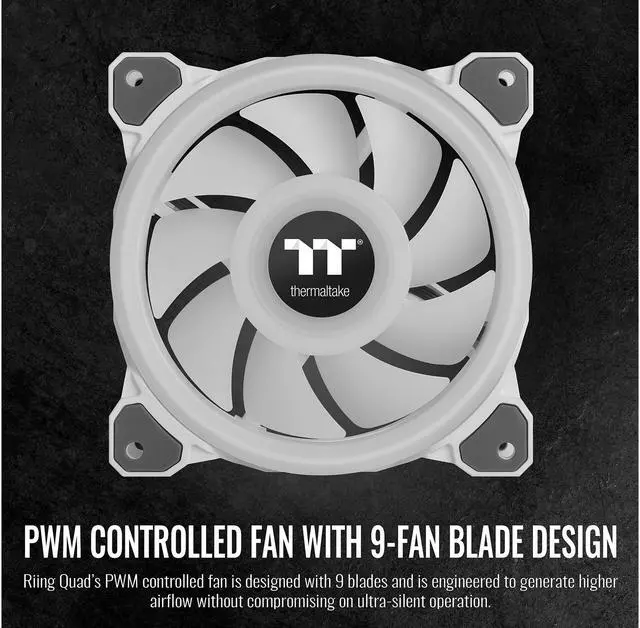 Riing Quad's PWM controlled fan is designed with 9 blades and is engineered to generate higher airflow without compromising on ultra-silent operation.