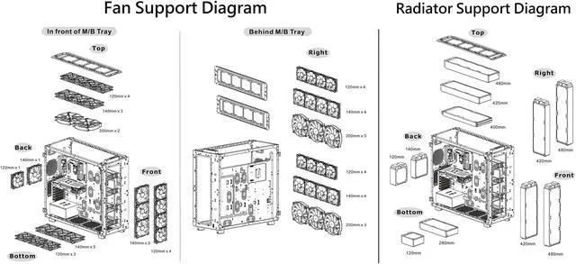 | Fan Support | Front: 4 x 120mm , 3 x 140mm Top: 4 x 120mm , 3 x 140mm , 2 x 200mm Rear: 1 x 120mm , 1 x 140mm Bottom: 3 x 120mm , 3 x 140mm Right Side(Behind M/B Tray): 8 x 120mm , 8 x 140mm , 6 x 200mm |