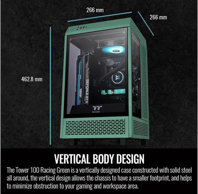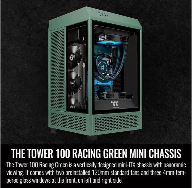 Designed to expand the legacy of The Tower 900 E-ATX Super Tower Chassis, the Tower 100 Racing Green Mini Chassis is the newest member of The Tower Series. It features three 4mm tempered glass windows for a stunning view and two preinstalled 120mm standard fans on top and at the rear for exhaust. It is a much smaller version of The Tower 900 with dimensions of 462.8mm (Height), 266mm (Width), and 266mm (Depth).
