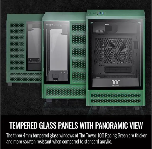 The three 4mm tempered glass windows of the Tower 100 Racing Green are thicker and more scratch resistant when compared to standard acrylic. It not only creates a panoramic view for displaying internal components but also gives users an easy and quick access once the top panel and the three tempered glass windows are removed.
