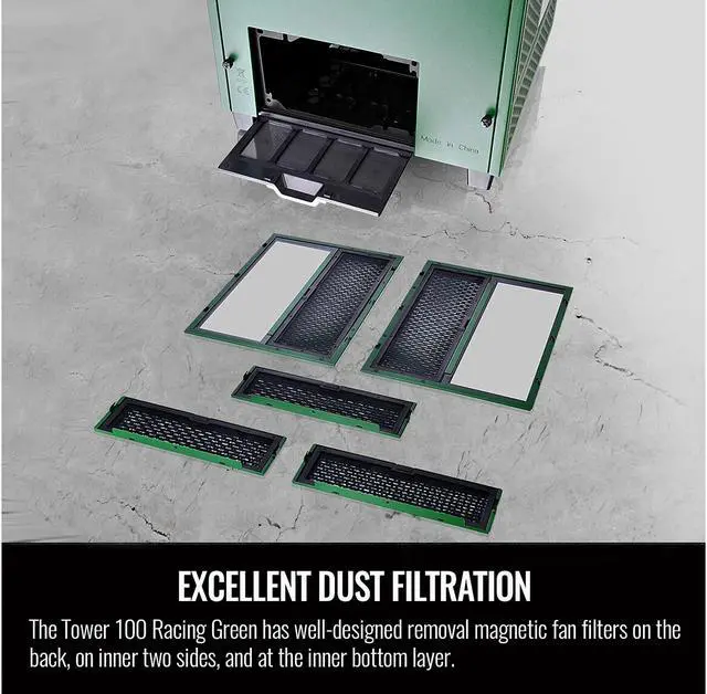 The Tower 100 Racing Green has well-designed removable magnetic fan filters on the back, on inner two sides, and at the inner bottom. At the base, the removable filters provide excellent dust protection and dirt reduction, ensuring a dust-free environment.