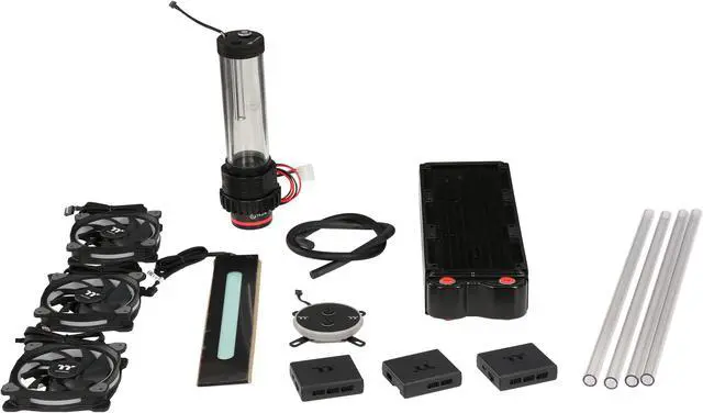 | Features | Support TT RGB PLUS Software and TT RGB PLUS App High-Quality 16.8M Colors CPU Water Block with a Universal Mounting Mechanism 300ml Reservoir with a D5 Pump, Manual Speed Control Knob and 16.8M Colors LED Cap 360mm Radiator with a 16.8M Colors LED Strip and High-Density Fin Design (FPI: 14) Software-Controlled 120mm PWM Fan with a Patented 16.8M Colors LED Ring (3-Pack Fans) A Complete Kit: Including (1) 1000ml Transparent Coolant, (8) PETG Tube 16mm OD Compression Fittings, (2) 90° Adapters, (1) Pack of 4x500mm PETG Hard Tubes |