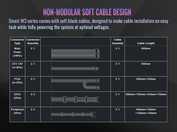 The Smart W3 series is certified by 80 PLUS efficiency and designed to meet ATX 3.1 standards. It's perfect for budget-conscious users seeking an efficient and reliable entry-level power supply.