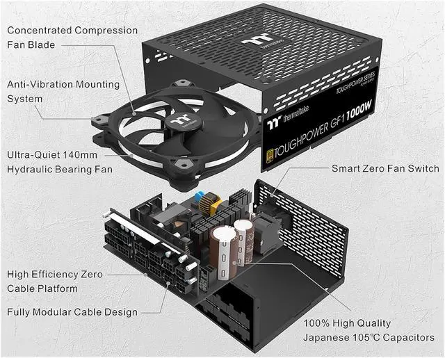 The fully modular Toughpower GF1 series now comes in 1000W and built to deliver 80 PLUS Gold efficiency. The series features a 140mm hydraulic bearing fan, Japanese capacitors and other premium components to help deliver a continuous and stable power with an ambient temperature up to 50°C, while near silent operation and reliable performance are guaranteed. With an ample 10-year warranty, the Toughpower GF1 1000W Gold is able to satisfy the market where PC enthusiasts are looking for a premium power supply with all the latest features.
