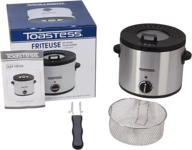 | Features | Variable temperature control and ready light indicates optimum cooking temperature Wire mesh basket with removable safety locking handle rests on the edge of the fryer to allow oils to drain from fried foods Removable lid with permanent washable anti-odor fi lter for easy cleaning Viewing window in lid to monitor cooking progress Cool wall construction, stay cool handles Non-stick bowl 3 ft breakaway power cord |