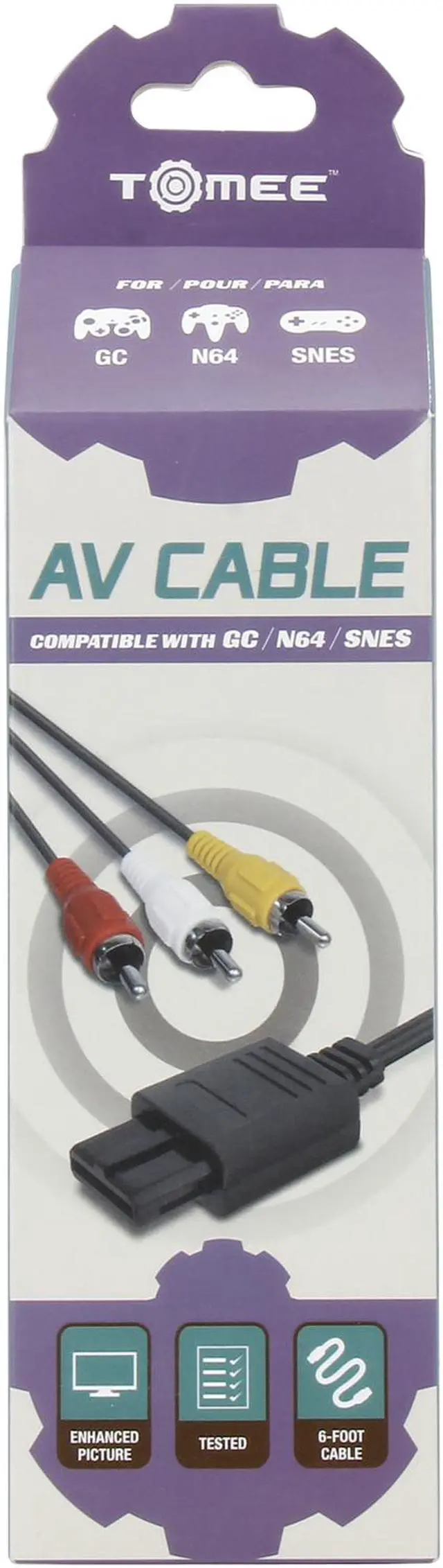 | Feature | Replace your broken or lost standard AV cable with the Tomee AV Cable for SNES, GameCube and N64. This cable provides the same picture quality as the standard AV cable included with your SNES, GameCube, or N64 console. Product Features - Connect your SNES, GameCube, or N64 to a television with the video connector - Same picture quality to standard cable included with the SNES, GameCube and N64 console - Easy connections with the color-coded connectors |