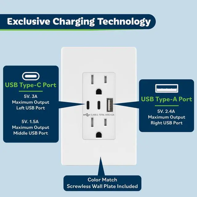 The TOPGREENER TU21542AC2 4.2 Amp USB Outlet is one of the most efficient charging solutions for the home and office. This 15 amp, tamper-resistant electrical outlet replaces any in-wall receptacle so that you can charge devices simultaneously and adapter-free.