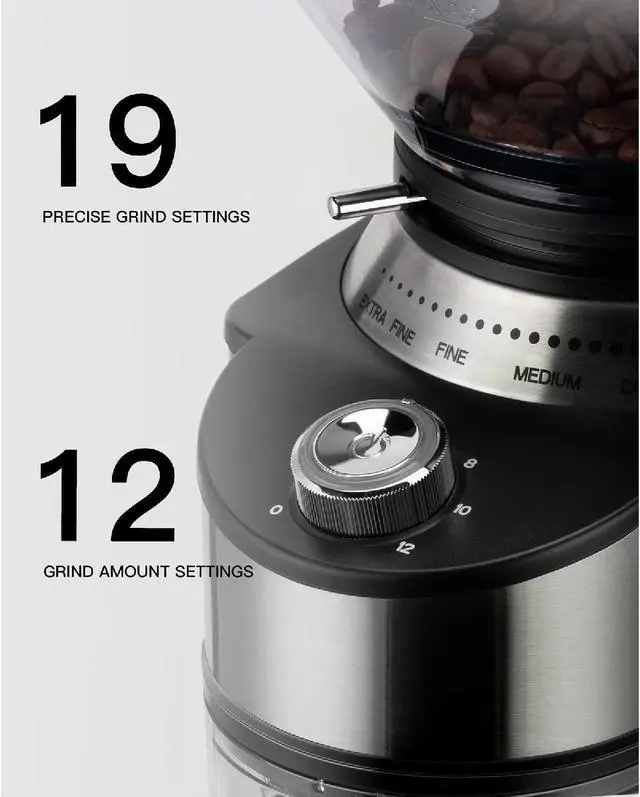 • 19 Precise Grind Settings: This electric conical burr coffee grinder features 19 different grind settings. Use COARSE settings for French press coffee; MEDIUM & FINE for Pour Over/Drip Coffee/Espresso; EXTRA FINE for Manual brewing/Turkish coffee.