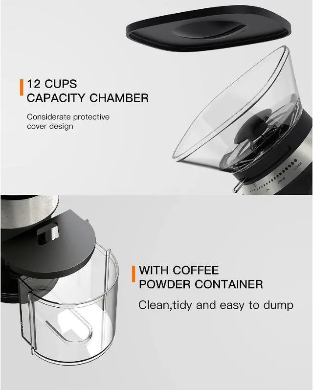 • 2-12 Adjustable Cups: Choose the amount freely up to 12 cups to suit your grinding needs. The resealable dust-proof lid helps keep coffee fresher for longer.