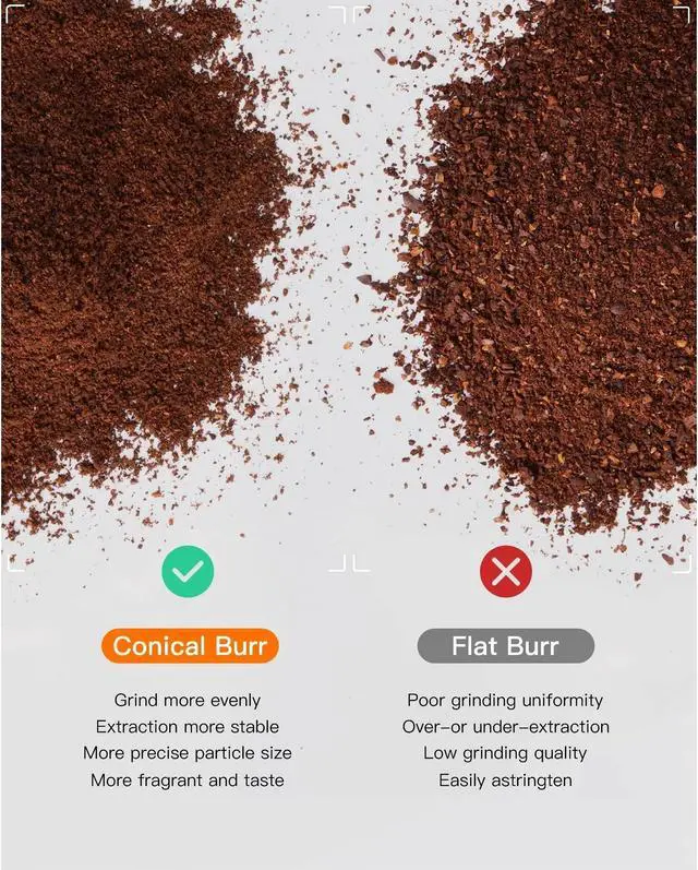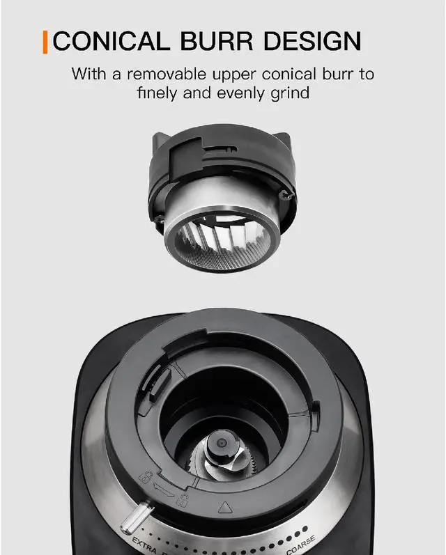 • Conical Burr Grinder: The stainless steel conical burr helps uniform evenly ground coffee powder in seconds. The professional grade coffee grinder ensures none of the beans essential oils are lost by way of oxidation, ensuring the richest quality flavor and aroma.