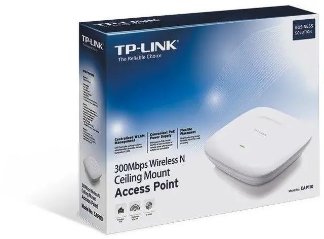 SpecificationsMfr Part Number: EAP110Features:EAP Controller Software enables administrators to easily manage hundreds of EAPsSupport Passive PoE for convenient and affordable installationSimple mounting design to easily mount to a wall or ceiling300Mbps wireless data rate for uninterrupted wireless connectionCaptive portal provides one convenient method of authentication for Wi-Fi guestsRate limit on per SSID to restrict the bandwith of each clientAccess Control restricts or allows the client to access the specified network segmentReboot Schedule enables all the APs to be rebooted automatically within a specified timeWPA/WPA2-enterprise, 802.1X with RADIUS secure authentication and rogue access point detection ensure the security of WLANMulti-SSID divides multiple wireless network for different usersLoad balance ensures large numbers of users have smooth network experiences in large business networksCompatible with 802.11 b/g/n productsAdopts Low Smoke Zero Halogen (LSOH) materials fo