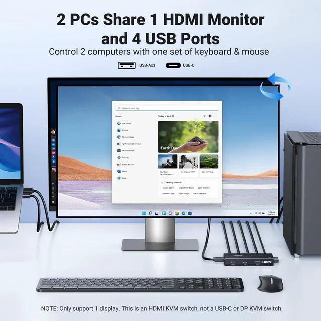KVM Switch 1 Monitors 2 Computers: This HDMI KVM Switch can control 2 computers to share 1 monitor and 4 USB 3.0 devices such as a set keyboard, mouse, hard drives, U disk, and printer. It's not only a keyboard mouse switch Switch, but also an HDMI switch. You can easily switch between two hosts, which keeps your workspace tidy, and helps to maximize productivity