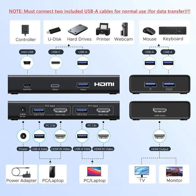 NOTE: 1, Each PC must be connected with an HDMI cable (for video transfer) and a USB cable (for data transfer) for normal use. 2, For stable use, please use the power adapter to connect to the power source for power supply. 3, Not supported for use with docking station. 4, This KVM switch is NOT a DP KVM switch or USB-C KVM switch. 5, Do not press the button on the switch or the desktop controller while connecting devices and cables