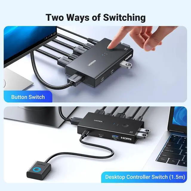 Support Up to HD 4K@60Hz: UGREEN KVM switches support resolution up to 4K@60Hz, and can also be backward compatible with 4K@30Hz, 2560*1440@120Hz or lower resolution. This KVM switch HDMI also supports HDMI 2.0, HDCP2.2/1.4, 3D and HDR, which makes images display more exquisite and realistic, color is more bright and moving. NOTE: Please ensure that the resolution of the two devices at the input and the device at the output is consistent