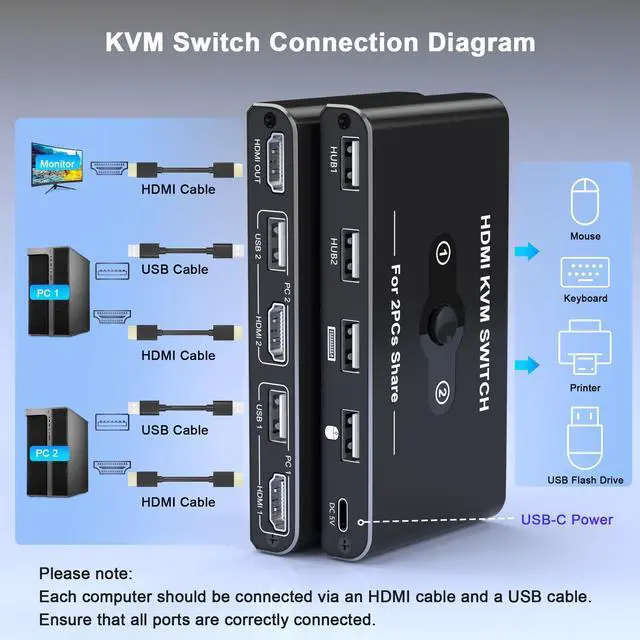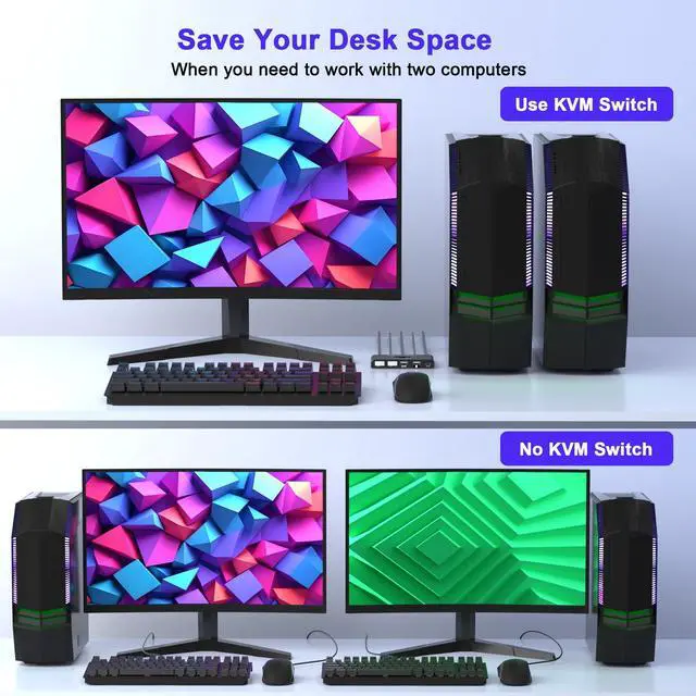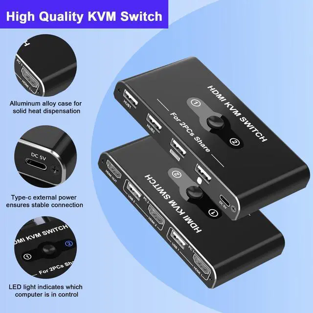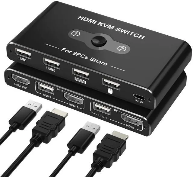 KVM Switch 1 Monitor 2 ComputersThis KVM switch for 2 computers 1 monitor allows two PCs to share one display, keyboard, and mouse. Simply press the button to switch between computers instantlyeliminating cable clutter. Perfect for dual computer setup or space-saving workstation, this single monitor KVM switch boosts productivity while reducing duplicate equipment costs. Note: Each device requires HDMI and USB-A ports. Converters may cause signal issues.