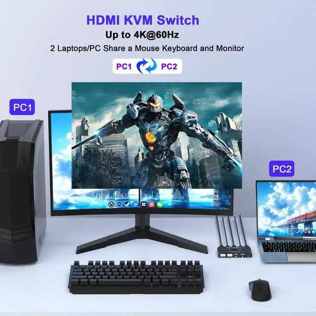 4K@60Hz HDMI KVM SwitchThe HDMI KVM switch 2 computers delivers crystal-clear 4K@60Hz video with vibrant colors, backward compatible with 1080P and 1440P resolutions. Ideal for gaming, design, or office use. For optimal performance, use a high-speed HDMI 2.0 cable (under 3.3 ft) and ensure your monitor and computer support 4K.