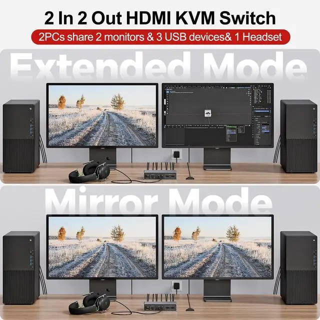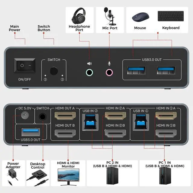 HDMI KVM Switch 2 Monitors 2 Computers 4K@60Hz USB 3.0 KVM Switches Share Dual HDMI Monitors 3 USB Ports for Keyboard Mouse Hard Drives Mic Headset Ports 2 Cable DC 5V Adapter Controller