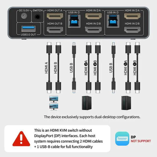 USAGE INSTRUCTIONS: This product is designed for use with desktop hosts only.The included USB A-to-B cable must be used. If HDMI and DP video outputs are required simultaneously, both host devices must have all necessary cables connected, including the USB B cable, HDMI cable.