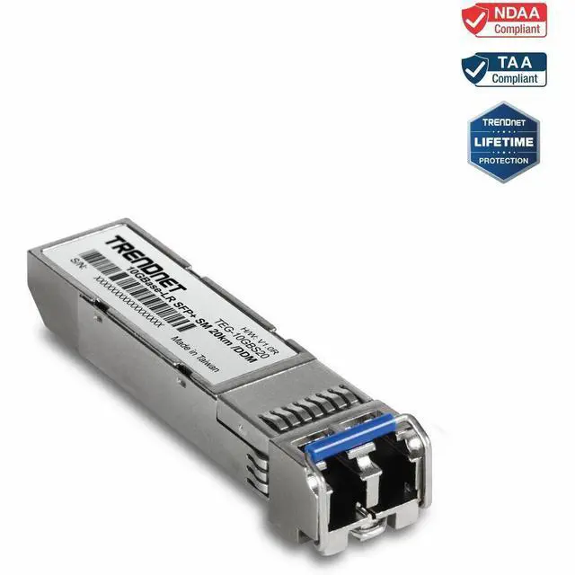 TRENDnet’s SFP+ Single Mode LC Modules are compatible with standard SFP+ slots found on network switches and fiber converters. Each single mode 10G SFP+ transceiver is equipped with a duplex LC fiber connection interface and supports highspeed data rates up to 10.31Gbps. All TRENDnet 10G SFP+ fiber modules support connections for reliable, long- distance network applications.
