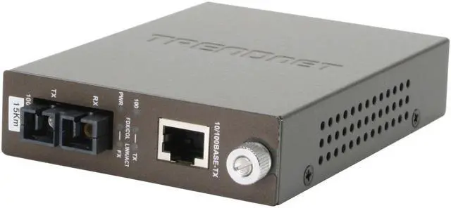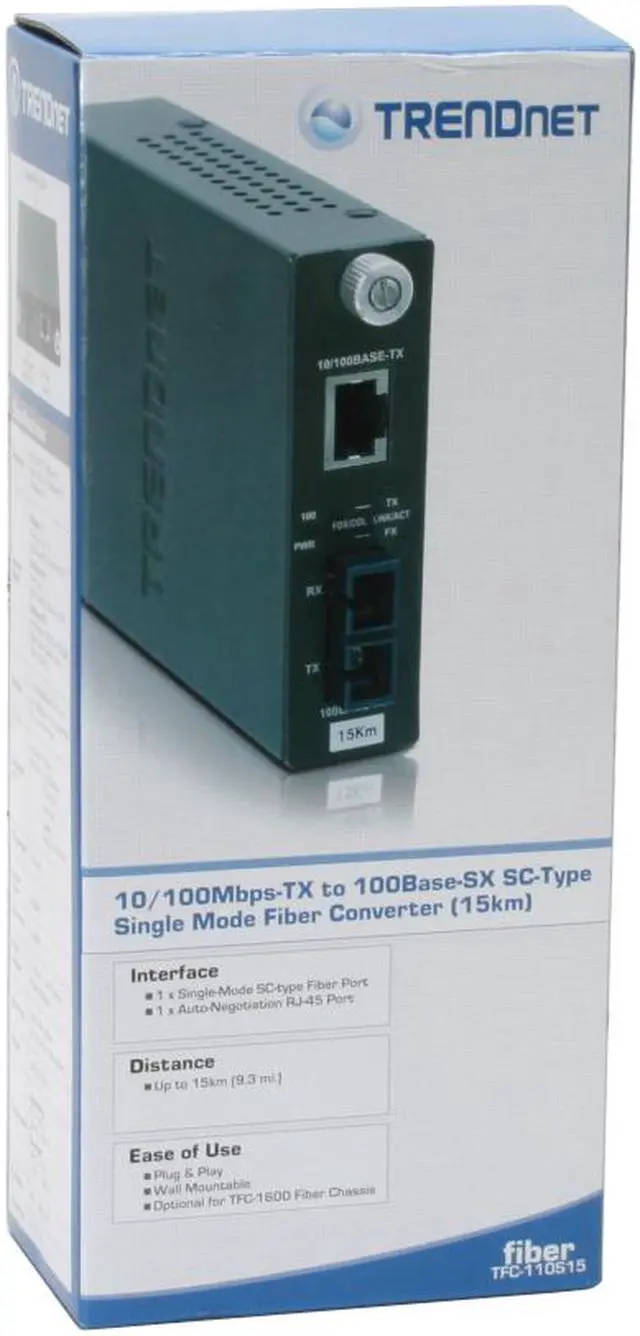 The TFC-110S15 Fiber Converter works with the TFC-1600 chassis system or as a standalone unit. This converter is a Single Mode SC-Type fiber converter spanning distances up to 15km (9.3 miles). Ports include 1 x 10/100Base-TX (RJ-45) port and 1 x 100Base-FX fiber port (SC-Type).