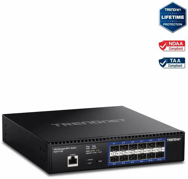 • 12 x 10G SFP+ slots • Support 1Gbps / 10Gbps link speeds • Web-based management • CLI management • Supports IPv6, LACP, VLAN, and IGMP Snooping • 802.1Q tagged-based VLAN, GVRP, and Voice VLAN support • QoS with queue scheduling support • Supports inter-VLAN routing and IPv4/IPv6 static routing • 240Gbps switching capacity • Supports 10GBASE-X / 1000BASE-FX SFP fiber modules • Smart fan • Save rack space by mounting 2 x TL2-F7120 into 1U space with the optional ETH-F71 dual mount bracket (sold separately) • NDAA / TAA compliant (U.S. and Canada only) • Lifetime Warranty