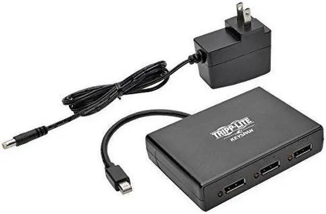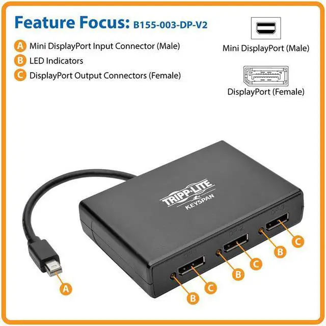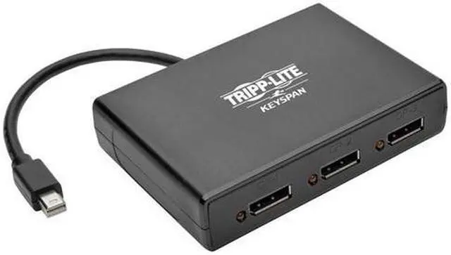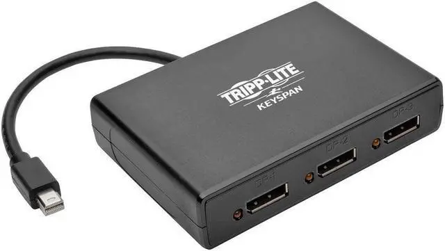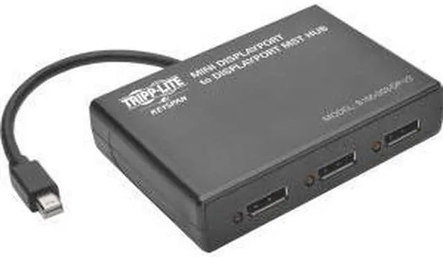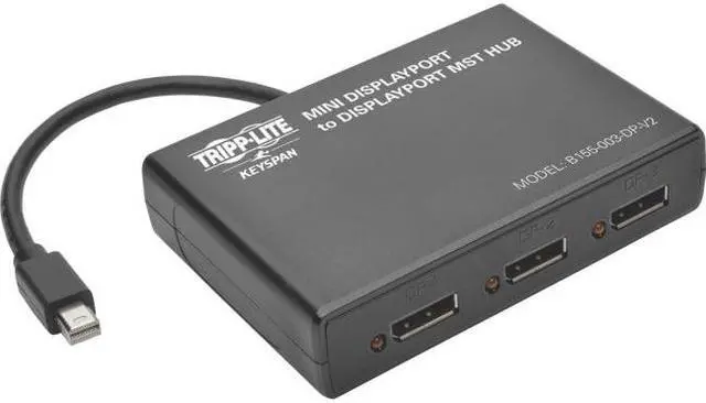 The B155-003-DP-V2 3-Port Mini DisplayPort 1.2 to DisplayPort MST Hub connects up to three DisplayPort monitors to the MDP output on your computer. Ideal for digital signage in schools, churches, conference rooms, trade shows, hotels and retail outlets, this hub allows you to display the same image on all three monitors, extend the desktop across them, or combine all three as one large monitor in video wall mode.