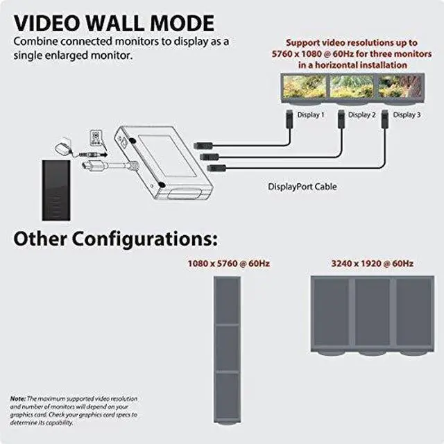 Supports expanded resolutions in video wall mode, such as 5760 x 1080 in horizontal 1 x 3 configuration