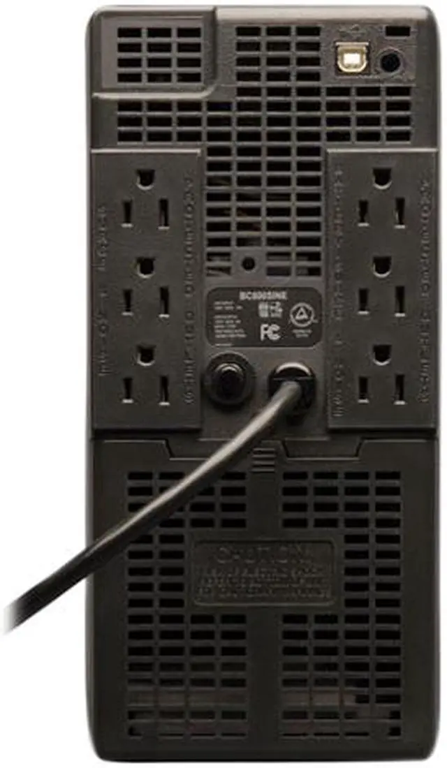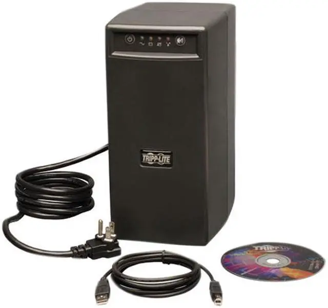 Tripp Lite's BC600SINE UPS system provides long-lasting battery backup for professional workstations, PCs, networking equipment and other sensitive electronics. Sine wave output in both line and battery power modes provides compatibility with all electronic loads, including PC and Mac systems fitted with Active Power Factor Corrected (PFC) power supplies. Uninterruptible Power Supply switches to battery derived sine wave AC output during power failures and severe voltage fluctuations so that connected equipment can be operated normally and shut down without data loss. Provides 18 minutes battery runtime with a typical desktop computer system (100 watts). Includes 3 battery-supported outlets for computer, monitor and one vital system peripheral, plus 3 additional surge suppression-only outlets for printers and other system accessories not requiring battery support. USB port enables optional unattended system shutdown without data loss in case of extended power failure; cable included. USB interface enables integration with built-in power management and auto shutdown features of Windows and Mac OS X. PowerAlert software is also included for a variety of desktop and network shutdown agents. Built-in audible alarm and 4 front-panel LEDs indicate line power status, battery power status, overload status and battery low/replace status. 650VA/375W power handling ability supports professional workstations, desktop PCs, point-of-sale equipment, small business phone systems, audio/video equipment and home theater systems. Supports user battery replacement via built-in access panel. 3-year warranty. $150,000 connected equipment insurance (USA, Puerto Rico, & Canada only). Key Features Tripp Lite?s BC600SINE tower, sine wave UPS system provides long-lasting battery backup for a variety of computer and electronic applications Sine wave output in both line and battery modes provides compatibility with all electronic loads, including PC and Mac systems fitted with Active Power Factor Corrected (PFC) power supplies BC600SINE UPS system switches to battery derived sine wave AC output during power failures and severe voltage fluctuations with enough time to shut down without data loss 650VA / 375 watt UPS capacity with 3.3 minutes runtime at 100% load and 11.1 minutes at 50% load Provides 18 minutes battery runtime with a typical desktop computer system consuming 100 watts Includes 3 battery-supported outlets for computer, monitor and one vital system peripheral, plus 3 additional surge suppression-only outlets for printers and other system accessories not requiring battery support USB port enables optional unattended system shutdown without data loss in case of extended power failure; USB cable included HID enabled USB interface enables integration with built-in power management and auto shutdown features of Windows and Mac OS X PowerAlert software CD included Built-in audible alarm with cancel switch warns of power failure conditions; once silenced, alarm will re-sound as batteries approach full discharge Alarm can be permanently silenced via PowerAlert interface 4 front panel LEDs indicate line power status, battery power status, overload status and battery low/replace status Supports user battery replacement via built-in access panel 3 year product warranty / $150,000 Ultimate Lifetime Insurance (USA, Puerto Rico & Canada only) Package Includes BC600SINE UPS System USB Cable Owner's manual