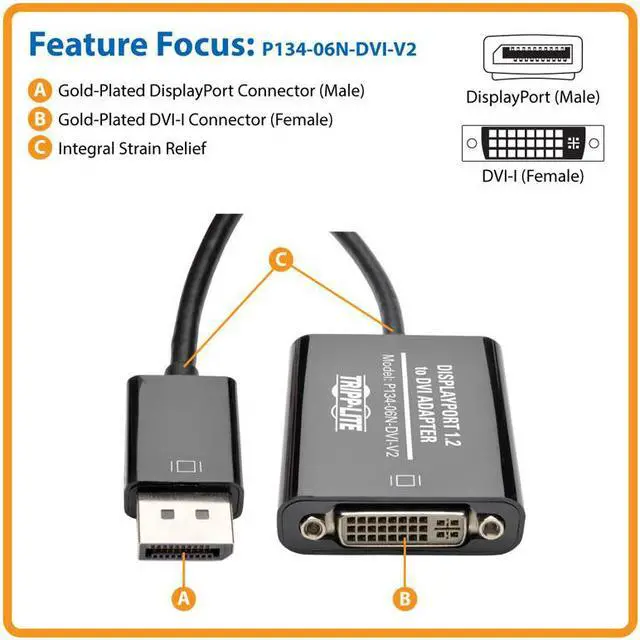 Plug and play with no software drivers or power supply needed. Gold-plated connectors and contacts ensure excellent conductivity. Integral strain relief ensures the converter and molded connectors last a long time. The P134-06N-DVI-V2 is backward compatible with previous DisplayPort generations and fits easily in a briefcase backpack or laptop bag for connecting on the go. Supports HD video resolutions up to 1920 x 1080 (1080p) Plug and play-no software drivers or power supply neededGold-plated connectors and contactsConverts both Single-Mode and Dual-Mode DisplayPort outputActive converter works with all DisplayPorts