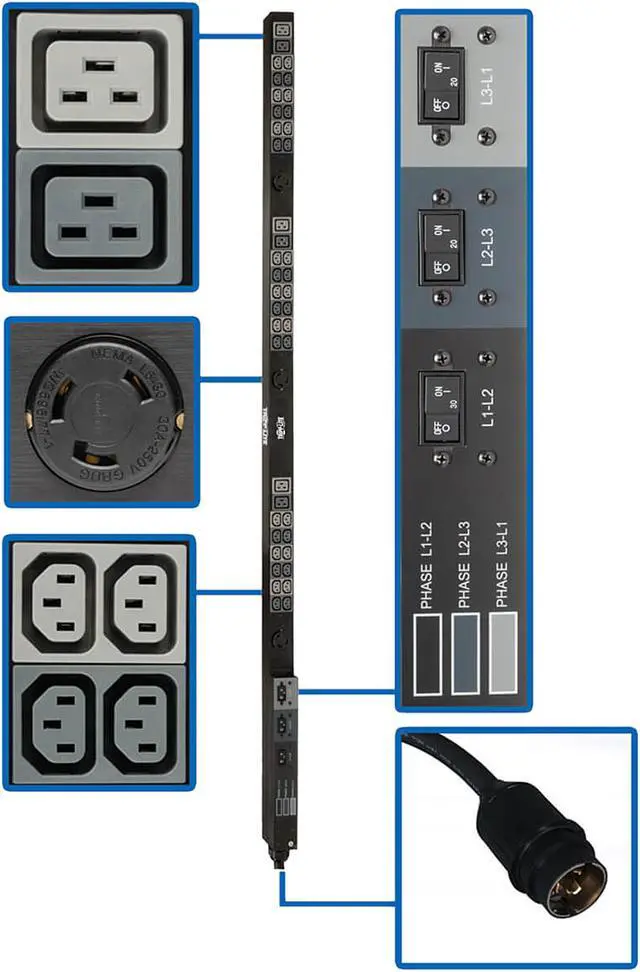 Delivers 208V 3-phase AC power to multiple loads from a utility outlet, generator or UPS system in a data center or network closet.