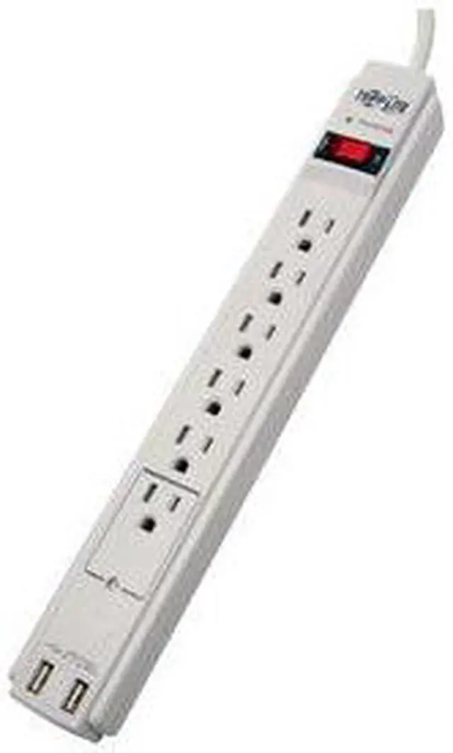 | Features | 2 USB charging ports - 2.1A total Surge suppression rating: 990 Joules EMI / RFI noise filtering 15A resettable circuit breaker Green protection LED Includes full normal mode (H-N) and common mode (N-G/H-G) line surge suppression Can accommodate 1 large transformer plug without covering remaining outlets, 3 total transformers Keyhole support for wall mounting Lighted power switch |