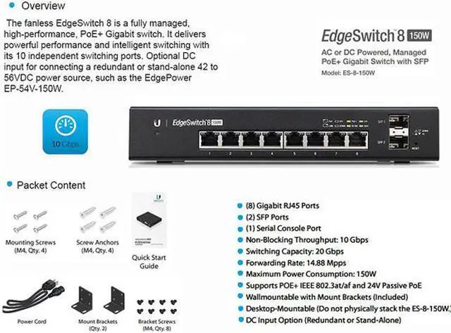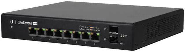The EdgeSwitch 8 (model ES-8-150W) features eight Gigabit RJ45 ports and two SFP ports.
