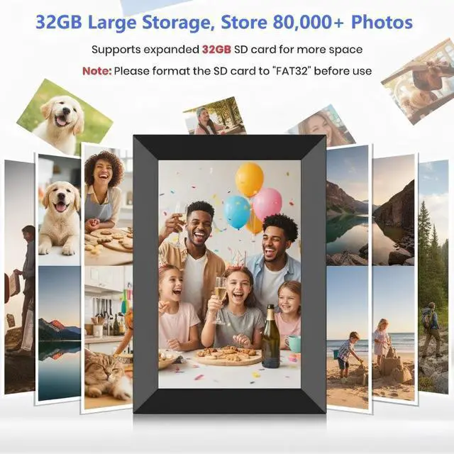 The digital frame built-in a 16GB storage (around 40,000 photos of 300KB/pc), you can also add a Micro SD card (Max Support 32GB) or Micro USB drive to the digital photo frame to upload, backup, and restore files.