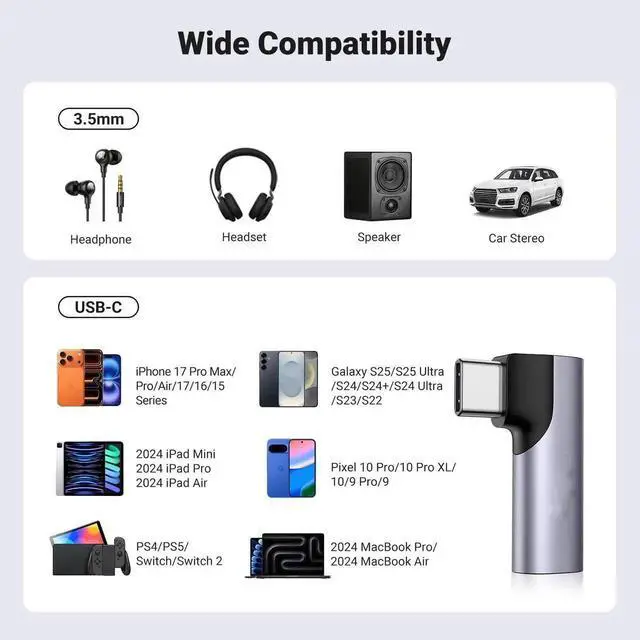 - Wider Compatibility: With an advanced DAC chip, the USB C Headphone Adapter is compatible with iPhone 17 Pro Max/17 Pro/Air/17/16 Pro Max/16 Pro/16 Plus/16/15 Pro Max/15 Pro/15 Plus/15, Samsung Galaxy S25/S25+/S25 Ultra/S24/S24+/S24 Ultra/S23/S23 Ultra/S23+/S22/S22 Ultra/S22+/S21/S21 Ultra/S21+, Google Pixel 10 Pro/10 Pro XL/10/10 Pro Fold/9 Pro XL/9/9 Pro/8/8 Pro/7/7 Pro/6/6 Pro, iPad mini/iPad Pro/iPad Air, iMac, Macbook Pro/Air, Mac mini, PS5, Switch 2, and most Type-C devices