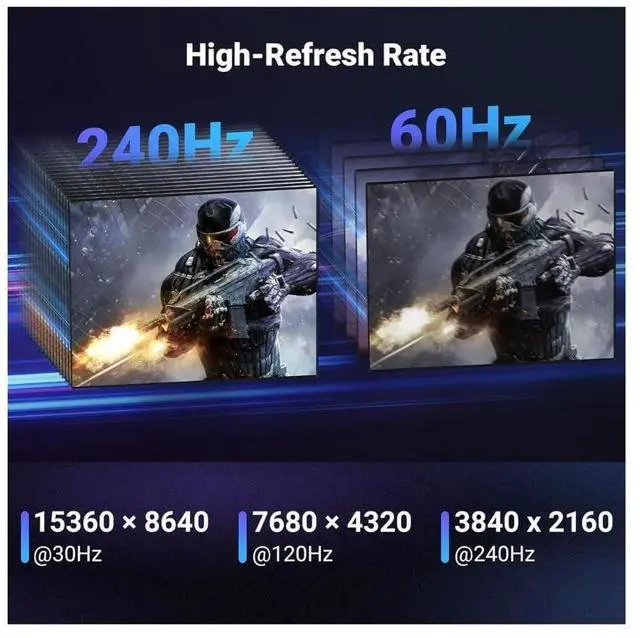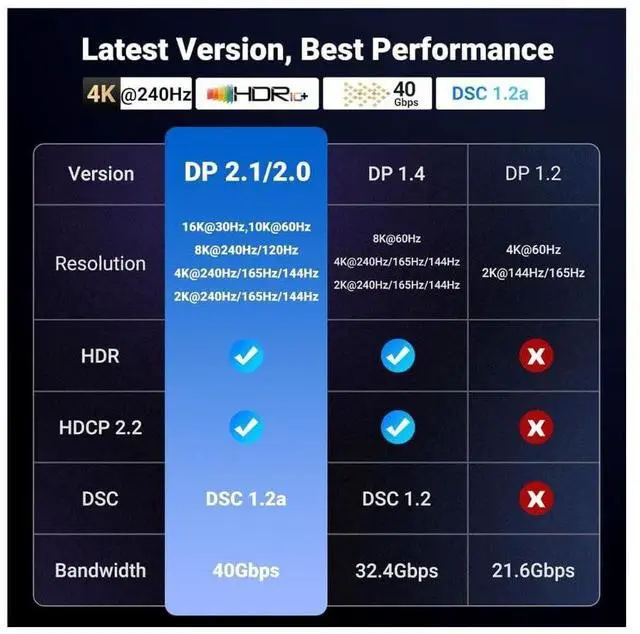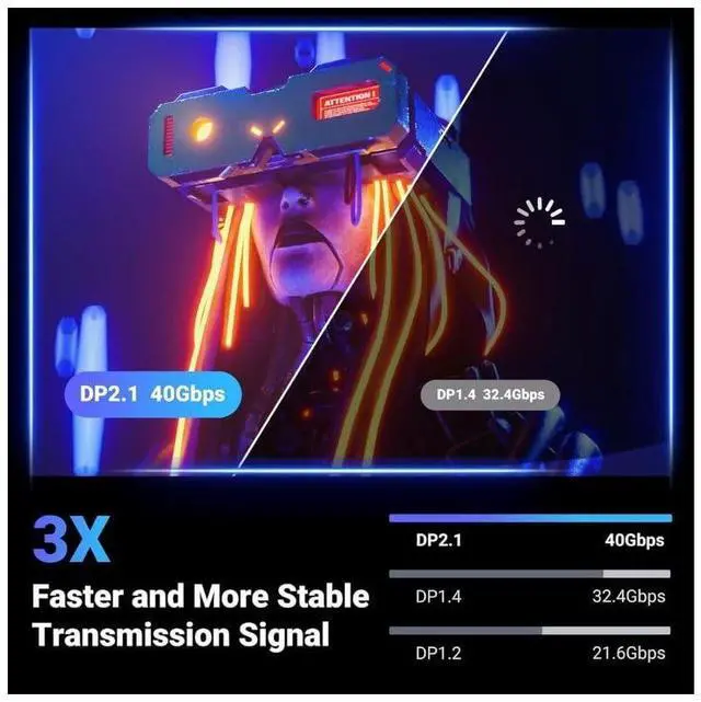 With a bandwidth of 40Gbps, this latest DP 2.1/2.0 cable actually offers 3X bandwidth as DisplayPort 1.4 (32.40 Gbps). It brings you a smoother gaming experience without lag and signal loss.