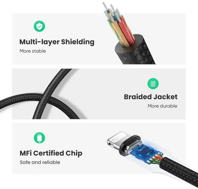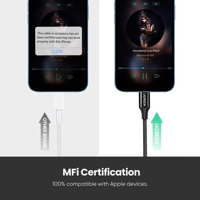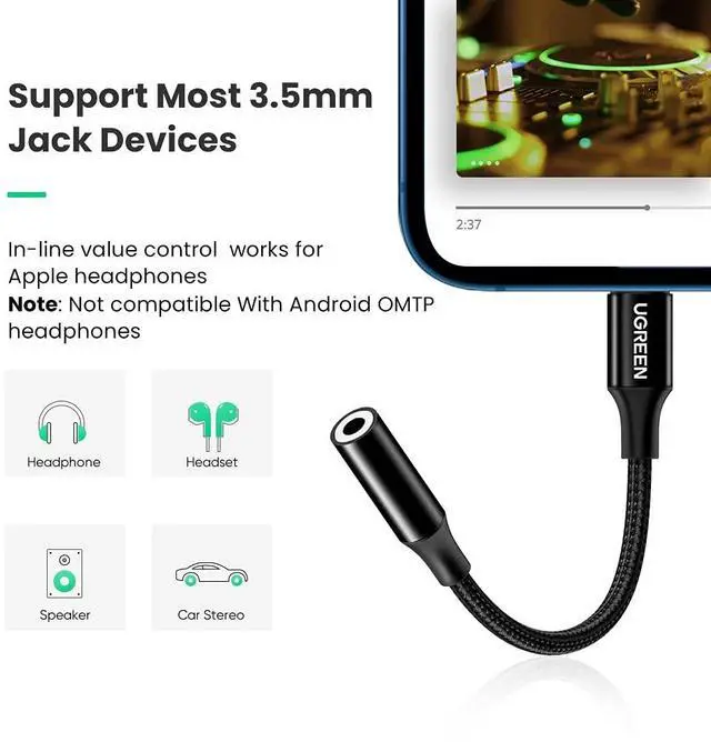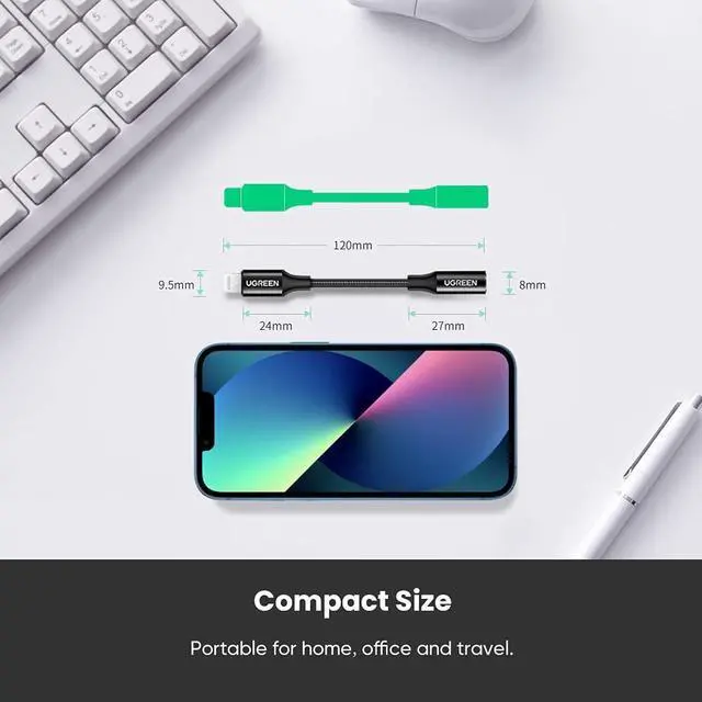 UGREEN 3.5mm plug to Lightning cable made from original Apple chips provides a secure and stable sound transmission. 100% compatibility to the iOS system without error message.